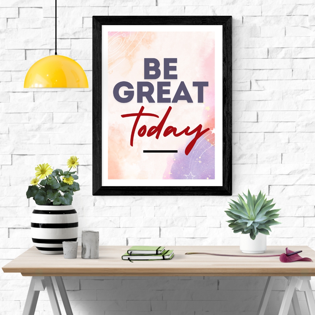 Embrace motivation with our Be Great Today wall art poster. This typography masterpiece will inspire you to be great today and every day. Hang it up in your workspace for a daily reminder to seize the day and be your best self. Because greatness is within reach!